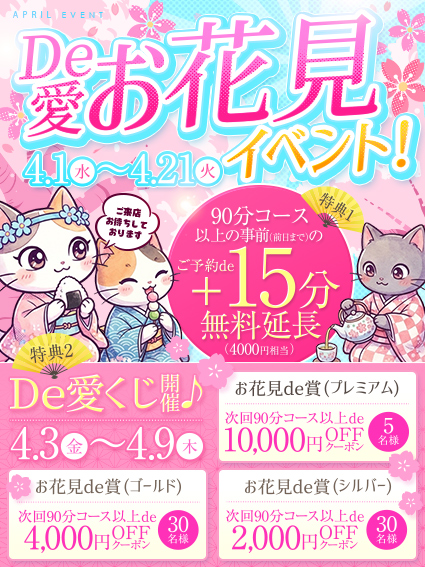 お花見de賞(ゴールド) 次回90分コース以上de4,000円offクーポン×30名様